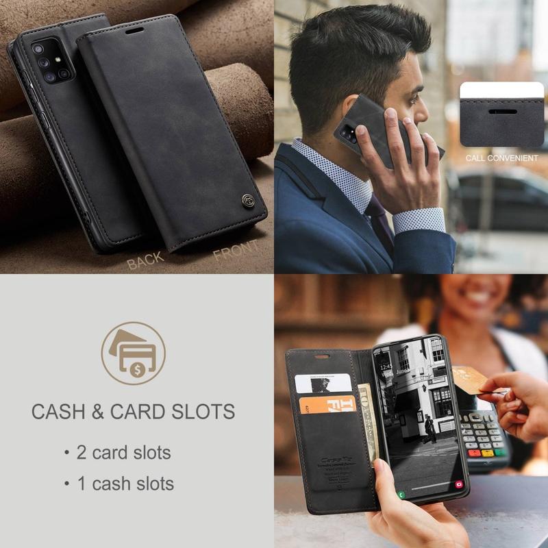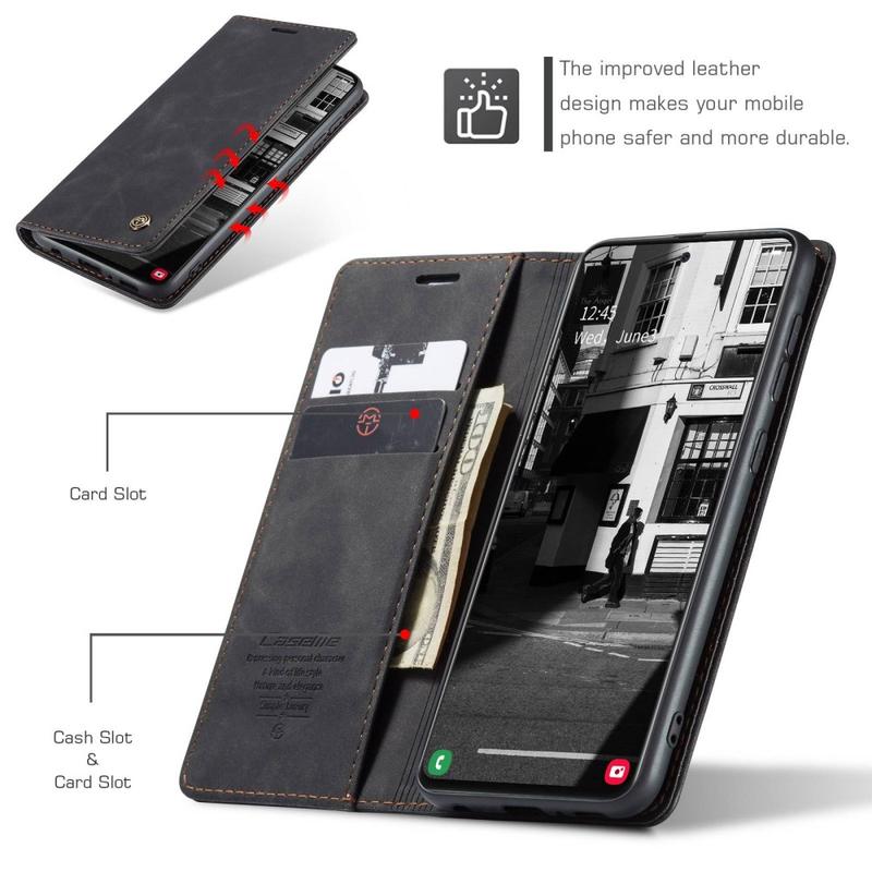 Peněženka Caseme 013 plně kryje a udržuje váš Samsung Galaxy A51 pěkně a bezpečně uvnitř díky navrženým vestavěným magnetům. Pouzdro také umožňuje vložit hotovost a kreditní karty zevnitř díky navrženým dvěma slotům a přihrádce na peníze.