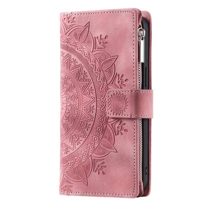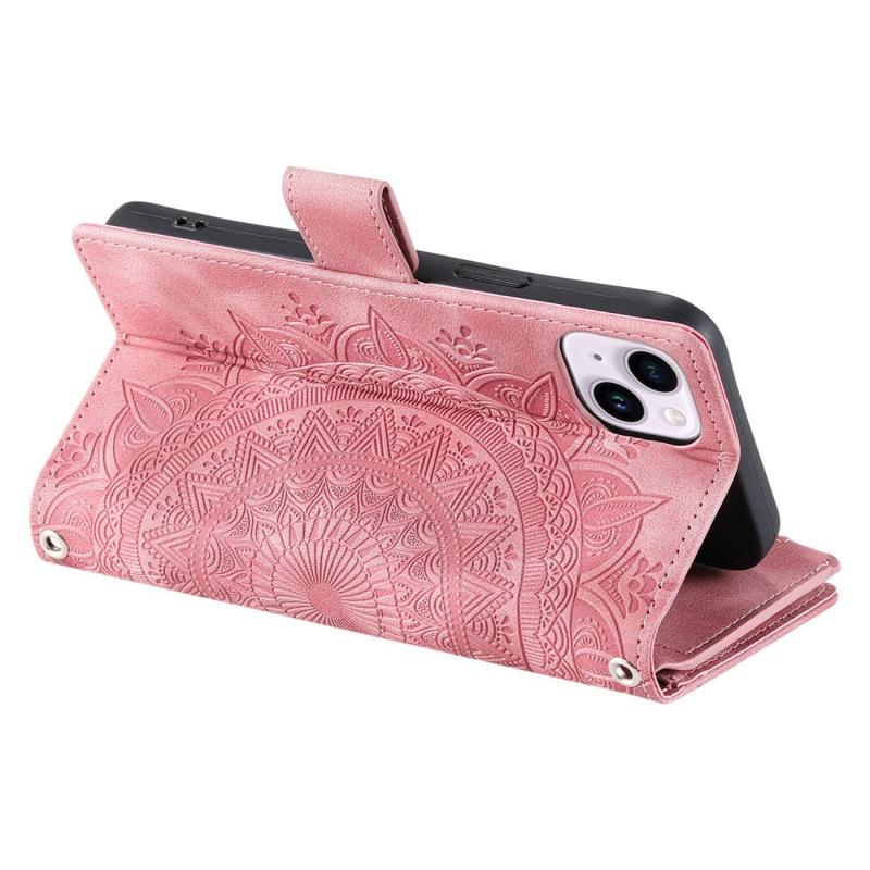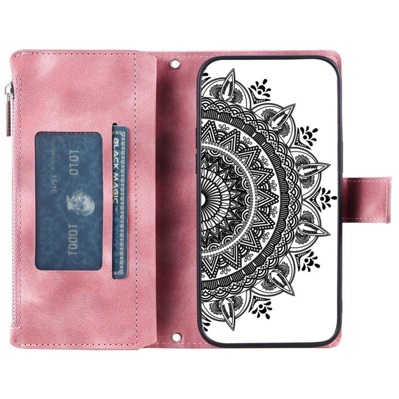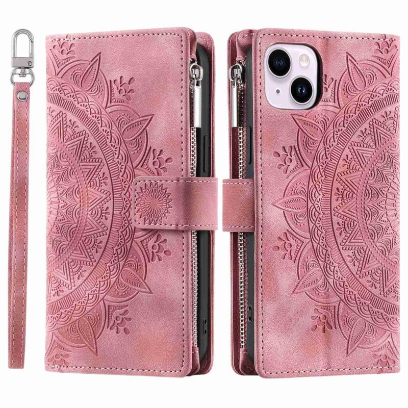 Kryt na telefon pro iPhone 14 Plus, odolný proti poškrábání, potištěný květ Mandala z PU kůže, stojan s více sloty na karty Kapesní pouzdro na zip