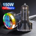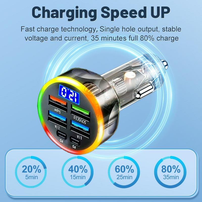Portable 6-Port Car Charger 150W - Fast Charging Adapter with PD & QC3.0, Voltage Display, LED Light, Multi-Device Support - 2x USB-C Ports, 4x USB-A Ports