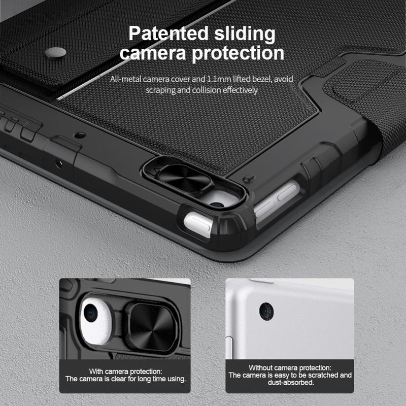 Pouzdro na Bluetooth klávesnici Nillkin Bumper Combo je navrženo tak, aby poskytovalo ochranu a rozšiřovalo možnosti vašeho iPad 10.2 2019/2020/2021. Toto multifunkční pouzdro je dodáváno s nastavitelným stojanem, odnímatelnou klávesnicí a chytrým trackpadem pro pohodlné psaní, sledování, čtení a skicování na vašem iPad 10.2 2019/2020/2021. Další funkcí je posuvný kryt pro fotoaparát iPad 10.2 2019/2020/2021, který chrání před škrábanci a prachem.
