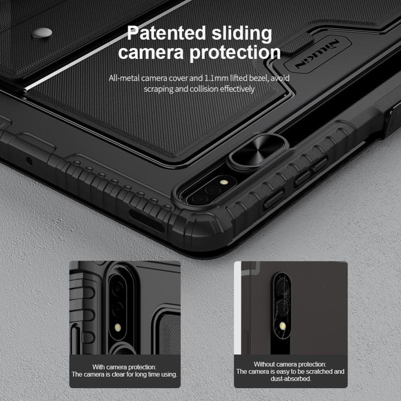 Pouzdro na Bluetooth klávesnici Nillkin Bumper Combo je navrženo tak, aby poskytovalo ochranu a rozšiřovalo možnosti vašeho Samsung Galaxy Tab S8+/S7+/S7 FE. Toto multifunkční pouzdro je dodáváno s nastavitelným stojanem, odnímatelnou klávesnicí a chytrým trackpadem pro pohodlné psaní, sledování, čtení a skicování na vašem Samsung Galaxy Tab S8+/S7+/S7 FE. Další funkcí je posuvný kryt pro fotoaparát Samsung Galaxy Tab S8+, který chrání před škrábanci a prachem.