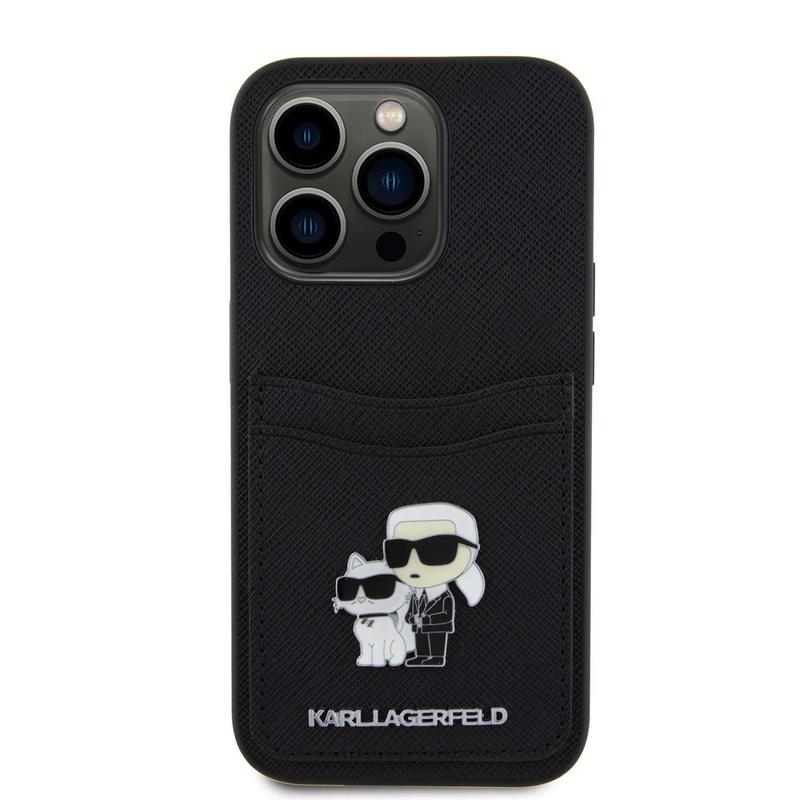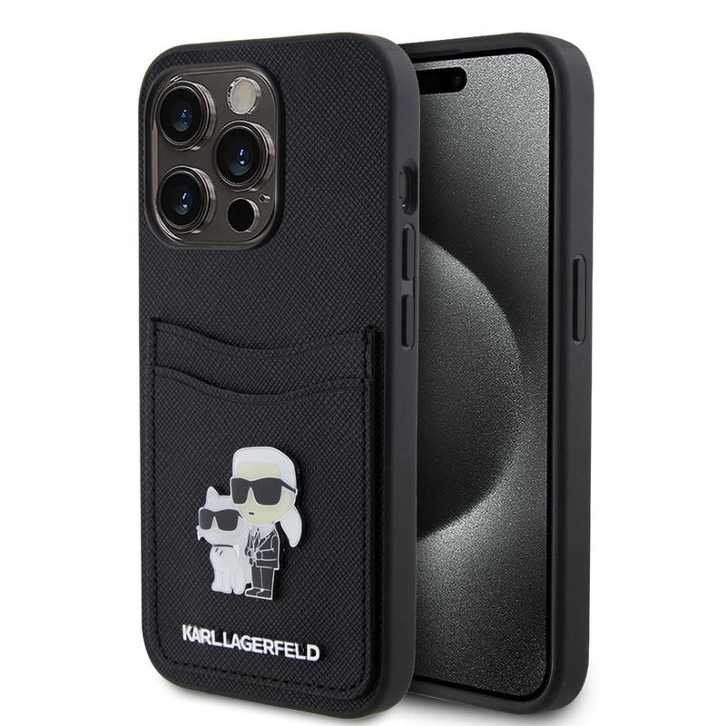Karl Lagerfeld Saffiano Card Slot Metal Karl & Choupette Case pro iPhone 15 Pro