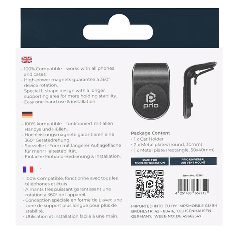 Jeďte na hrbolatických silnicích bez obav! Držák vzduchového ventilačního vozu Prio L je vybaven ultra-výkonnými magnety, které nabízejí pevné a stabilní držení pro vaše zařízení, aniž by z telefonu nebylo nutné odstranit ochranné pouzdro/kryt. Univerzální držák vozidla ve tvaru Prio L je dodáván se třemi lepicími kovovými deskami.