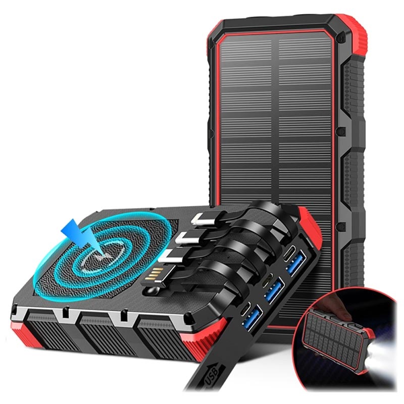 Psooo M2 Wireless Solar Power Bank s vestavěným bleskem, USB-C, USB-A a MicroUSB kabelem-20000MAH