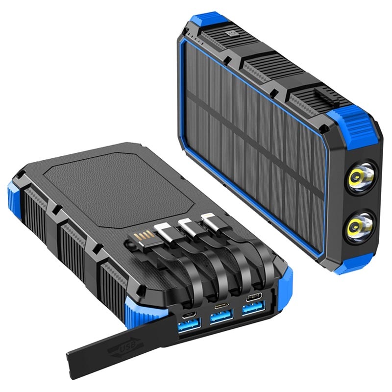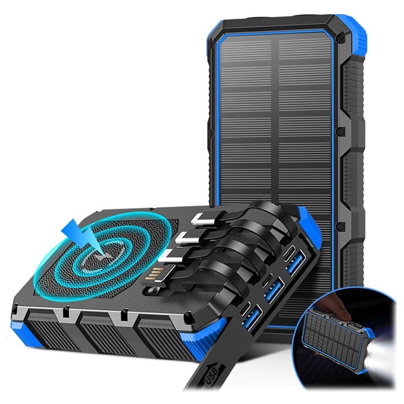 • Psooo M2 Wireless Solar Power Bank s vestavěným bleskem, USB-C, USB-A a MicroUSB kabelem-20000MAH