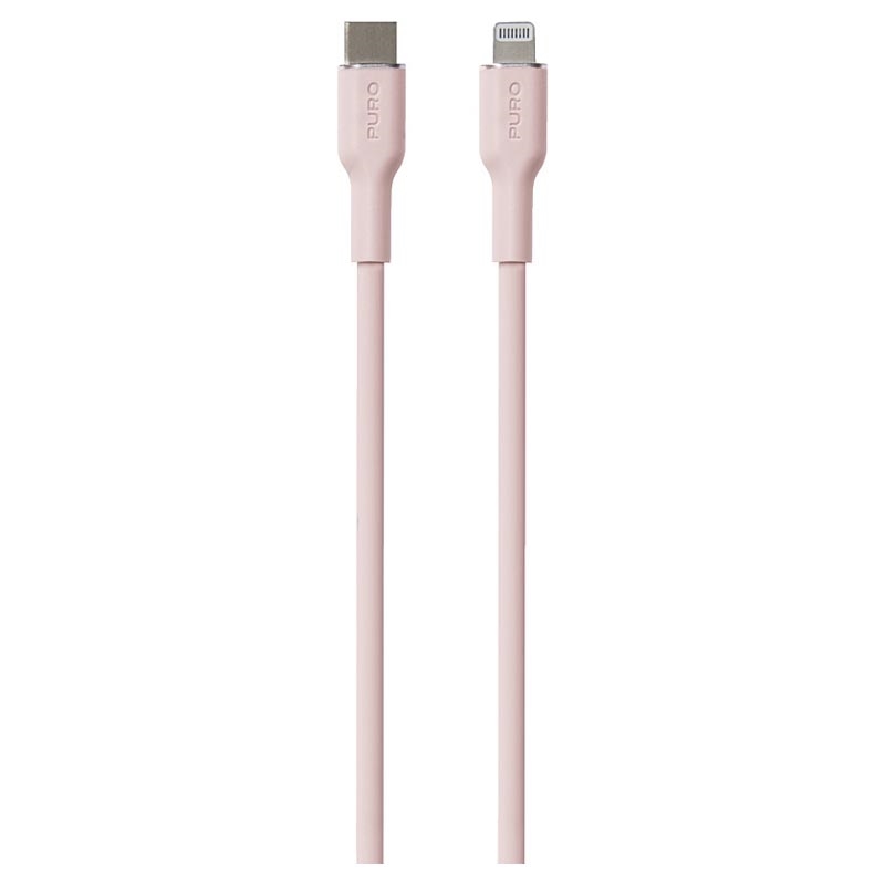 Měkký kabel s konektorem USB-C a Lightning z měkkého silikonu na dotek v tmavě růžové barvě.