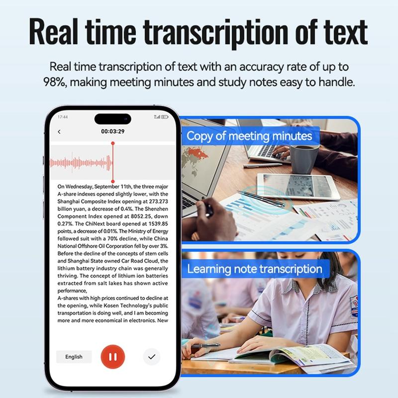 - Lectures & study sessions: Capture clear notes and convert them into searchable transcripts.