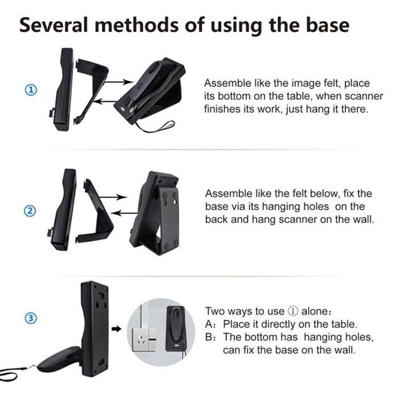 The 1000mAh battery provides up to 20 hours of continuous use, while the included charging base supports both handheld and fixed-position scanning.