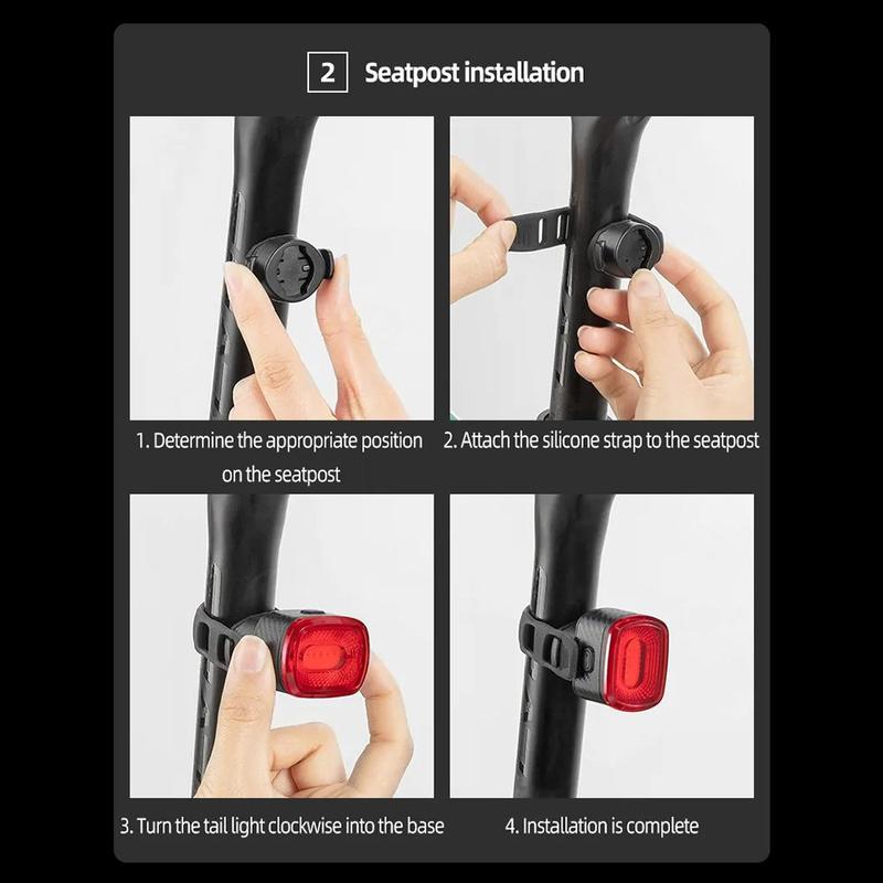 There are 4 light modes for your choice, (1) Slow Red Flash: the red light keeps on for 3s when braking in daytime,flash+brake light+intelligent 30s on-off at night. (2) Breathing Flash Mode: the red light keeps on for 3s when braking in the daytime, flash+brake light+intelligent 30s on-off at night. (3) Fast Flash Mode: flashing + brake Light on day and night. (4) Steady On Mode: flashing + brake Light on day and night. COB light beads make you more visible, which is more bright at night