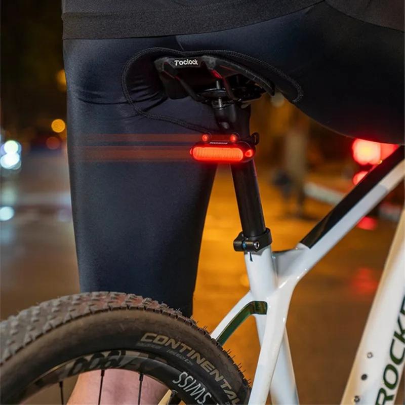 The bike taillight is equipped with a motion sensor and light sensor, which activate a highlight mode for 2s when the bike brakes, effectively warning riders behind