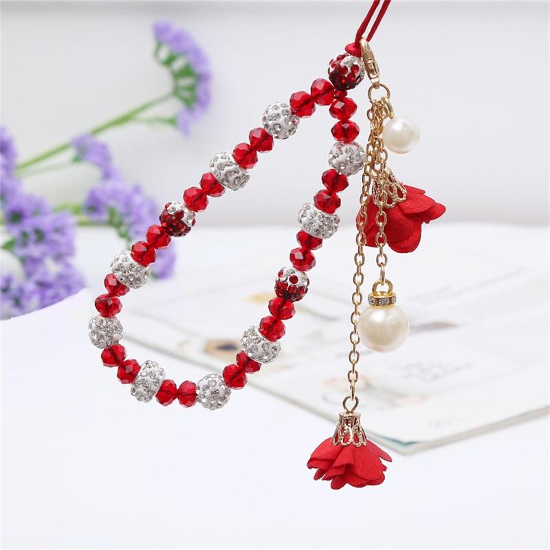 18.7cm Crystal Bead Phone Lanyard with Rose Flower Charms - Wrist Strap Hand Chain Mobile Accessory