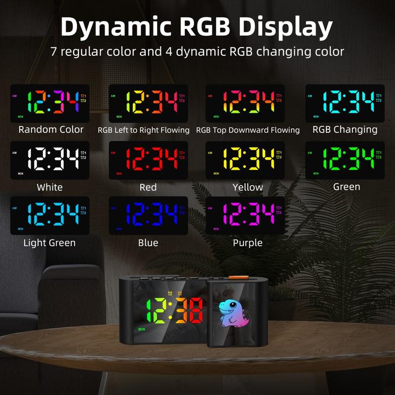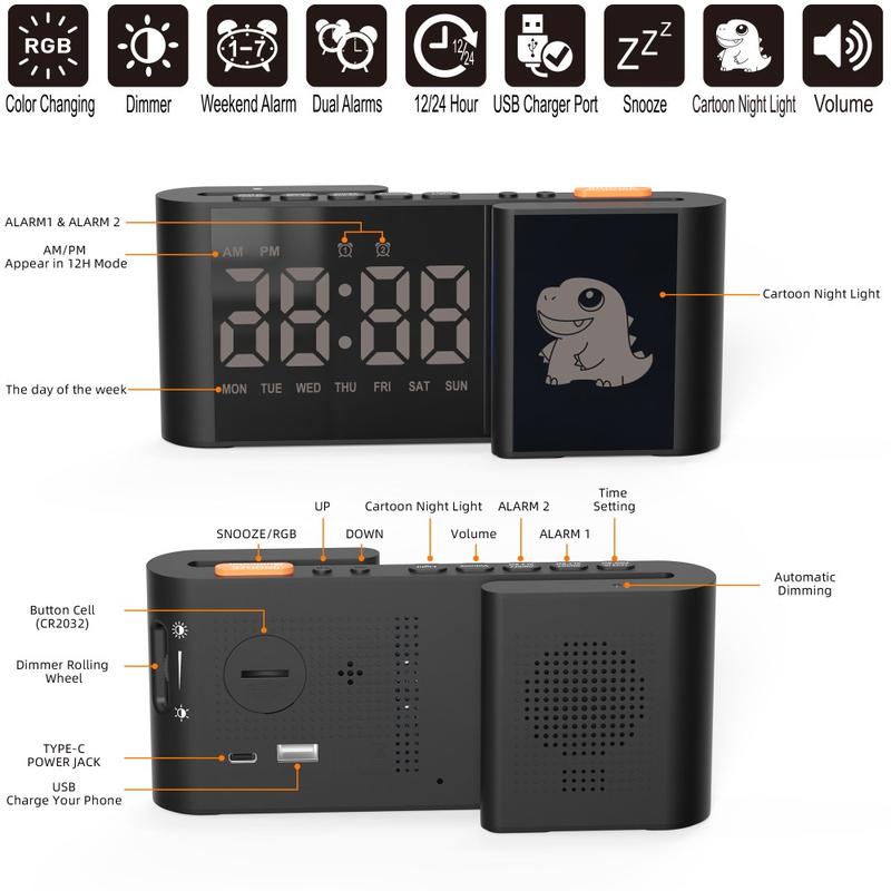 - Functions: Time, alarm, snooze, date, RGB night light, USB charging port
