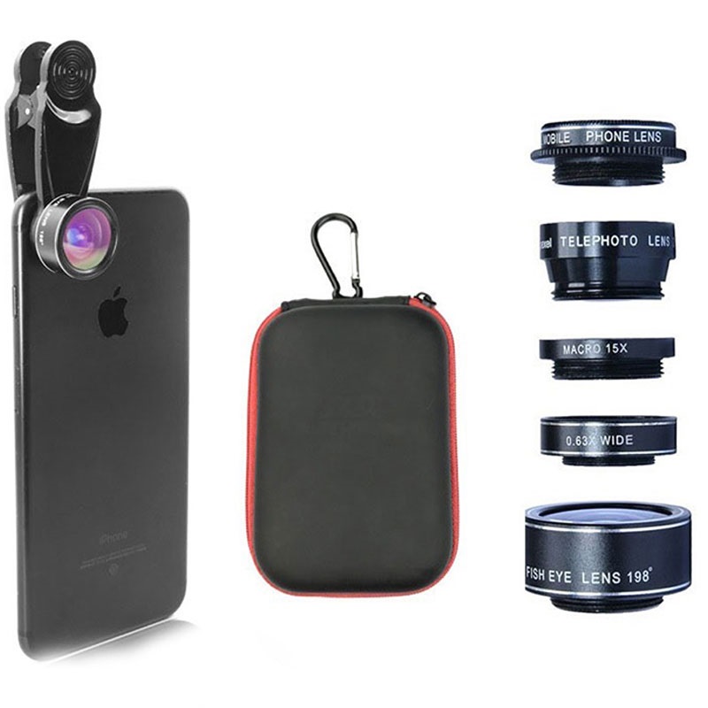 -5 typů čoček: 2x portrétní čočka, 0,63x širokoúhlý objektiv, 15x makro čočka, 198-stupňový rybí oční čočka, CPL polarizátor