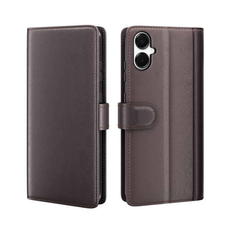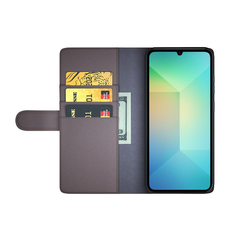 A high-quality sophisticated leather case for your Samsung Galaxy A06 5G. Give your phone a premium look, while keeping it safe from scratches and common damage. This multifunctional soft leather wallet case has inner pockets for cards and one larger pocket for cash. On top of that Samsung Galaxy A06 5G genuine leather case has hands-free viewing stand and front cutout for talking with case closed.