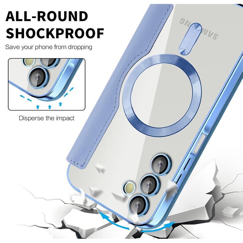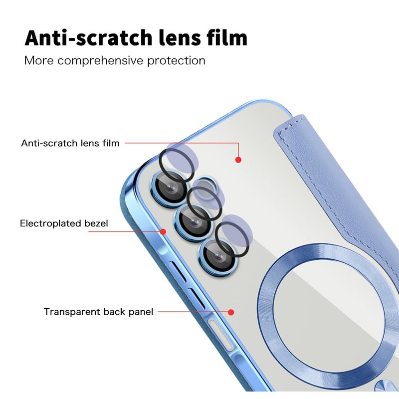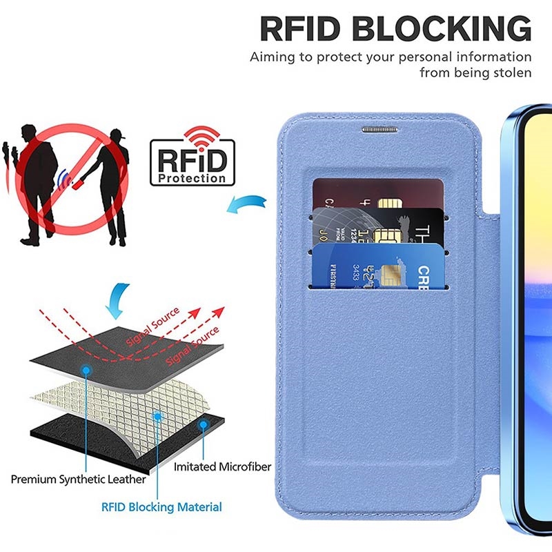 This premium Samsung Galaxy A15 case is crafted with high-quality TPU, Acrylic, and polyurethane, using a fine process to ensure a delicate and exquisite finish. It is equipped with a convenient card slot for easy swiping and spending on the go, and features a strong magnet for automatic closing, making it safe and convenient to manage items inside. This Samsung Galaxy A15 case provides effective protection against daily wear and tear, scratches, marks, and scrapes, while the advanced RFID blocking technology in the card slot ensures your personal information is protected from theft. Additionally, the built-in magnetic ring is compatible with MagSafe wireless charging, meaning you can charge your Samsung Galaxy A15 without taking off the case.