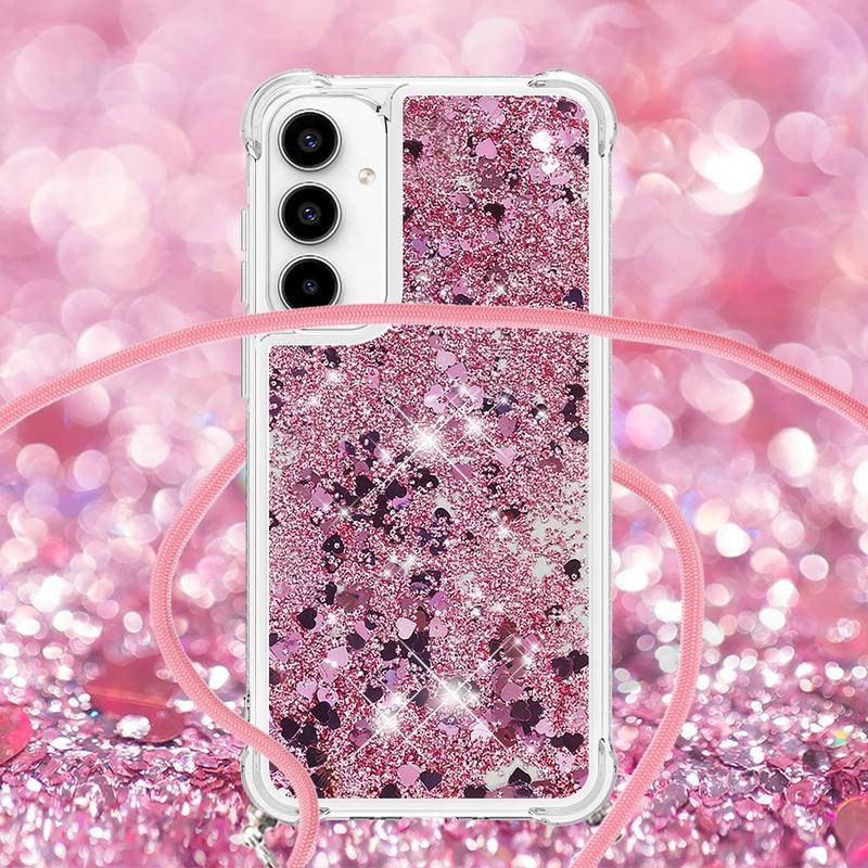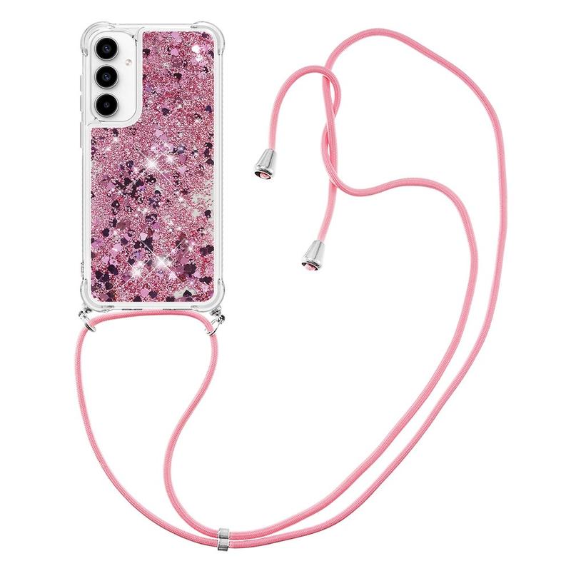 Transform your Samsung Galaxy A35 into a dazzling accessory with this sparkling protective case with a strap. This cover is made of highly durable TPU with reinforced corners that additionally safeguard your device. The case has exact cutouts for all ports and tactile side buttons so that you can use your Samsung Galaxy A35 as usual. At the same time, the long lanyard allows you to carry your Samsung Galaxy A35 safely and with more comfort.
