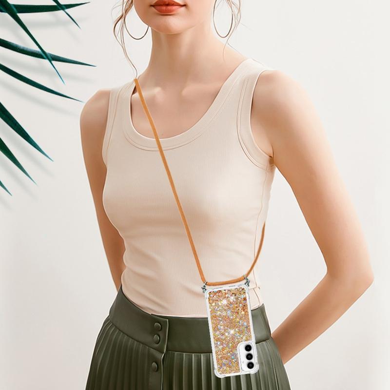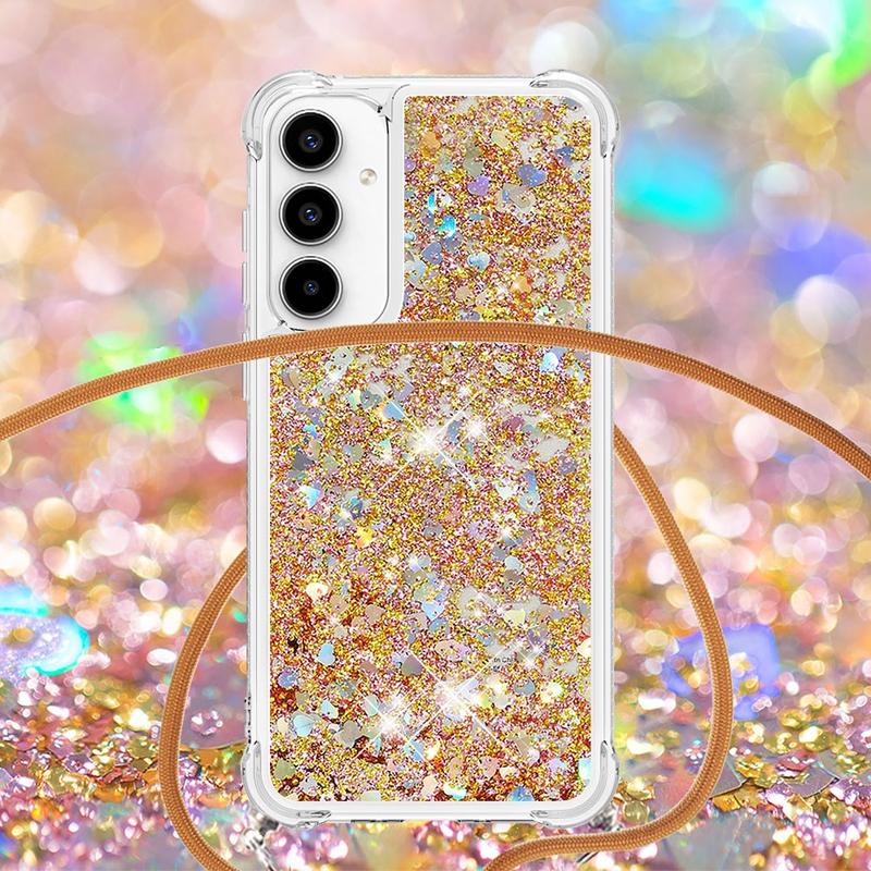 Transform your Samsung Galaxy A35 into a dazzling accessory with this sparkling protective case with a strap. This cover is made of highly durable TPU with reinforced corners that additionally safeguard your device. The case has exact cutouts for all ports and tactile side buttons so that you can use your Samsung Galaxy A35 as usual. At the same time, the long lanyard allows you to carry your Samsung Galaxy A35 safely and with more comfort.
