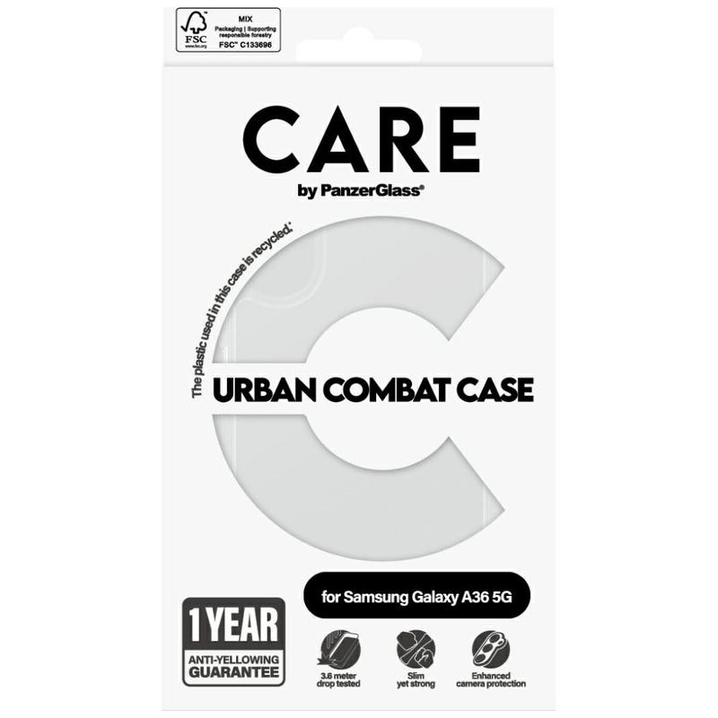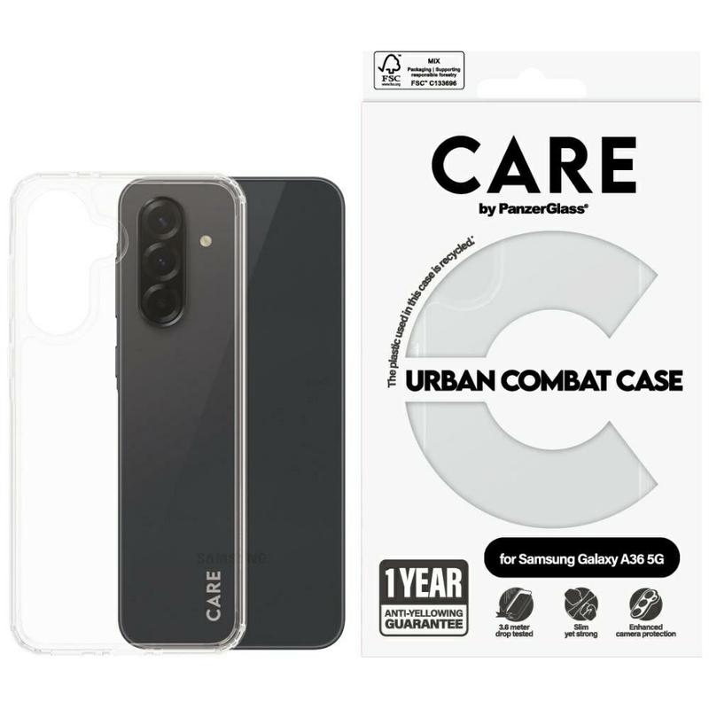 The CARE by PanzerGlass Flagship Case for Samsung Galaxy A36 Urban Combat with Clear Frame is designed for those who need robust protection without sacrificing style. Made from 100% recycled plastic, this case is built to withstand drops up to 4.8 meters and offers enhanced scratch and shock resistance. It is also compatible with wireless charging and comes with a 1-year anti-yellowing guarantee.