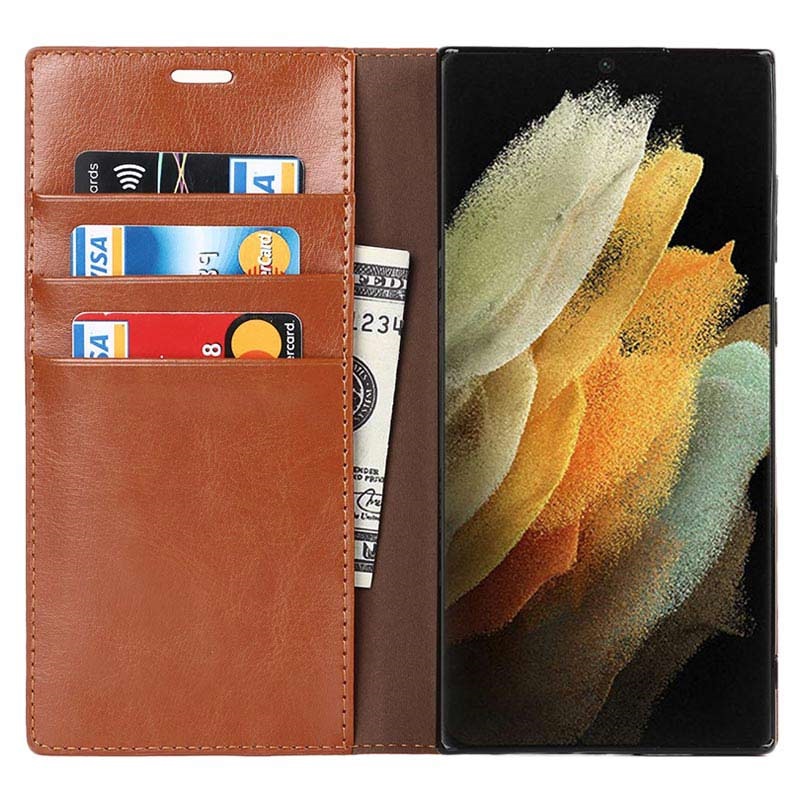 Vysoce kvalitní sofistikovaný kožený pouzdro pro váš Samsung Galaxy S22 Ultra 5G. Poskytněte telefonu prémiový vzhled a přitom jej udržujte před škrábancem a běžným poškozením. Tento multifunkční pouzdro na měkkou koženou peněženku má vnitřní kapsy na karty a jednu větší kapsu pro hotovost. Kromě toho má Samsung Galaxy S22 Ultra 5G pravá kožená pouzdro hands-free sledování a přední výřez pro rozhovor s uzavřeným pouzdrem.
