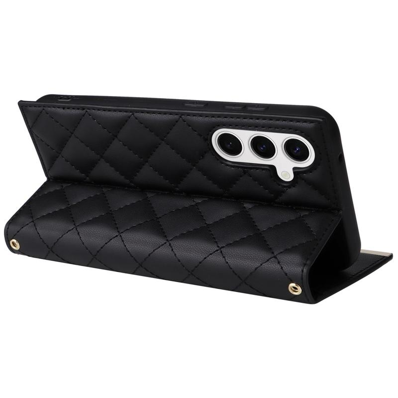 Protect your Samsung Galaxy S24 with this luxurious quilted wallet case. Constructed with TPU material coated with PU leather, this case is scratch-resistant and anti-fingerprint, keeping your phone looking stylish and sleek. The stitching line forms a rhombus grid pattern, adding a fashionable and beautiful touch to the case. The raised edge of the camera and screen offers effective protection against scratches, while the precise cutouts provide full access to all buttons, ports, and other features. The wallet design allows for easy storage of essential cards and cash, and the included suction cups can be used as a supporting stand for hands-free use. With added protection against scratches, impact, drops, and daily damage, this case also comes with a shoulder strap and wrist strap for added convenience.