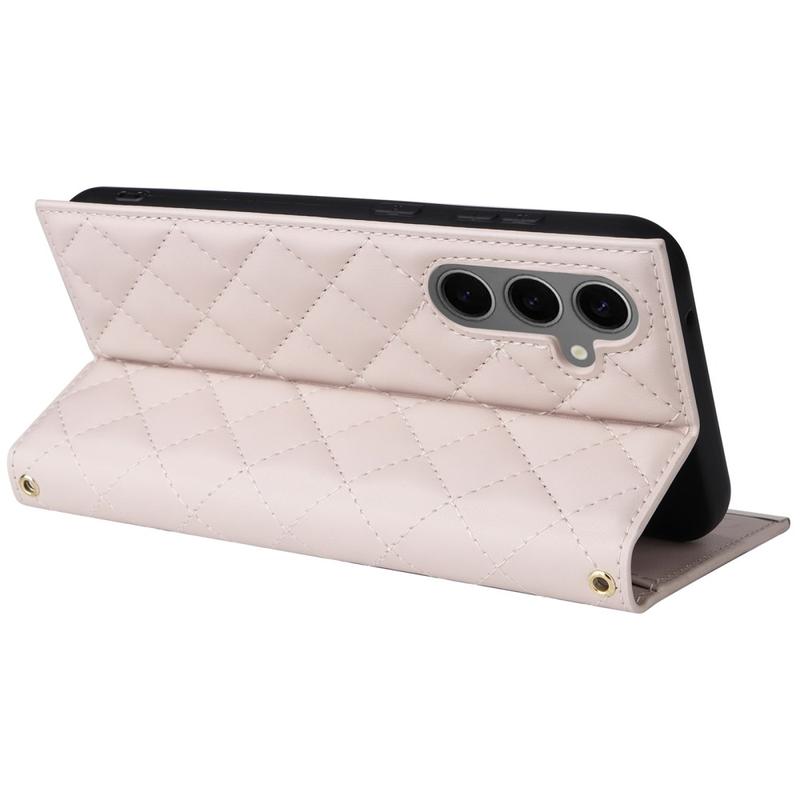 Protect your Samsung Galaxy S24+ with this luxurious quilted wallet case. Constructed with TPU material coated with PU leather, this case is scratch-resistant and anti-fingerprint, keeping your phone looking stylish and sleek. The stitching line forms a rhombus grid pattern, adding a fashionable and beautiful touch to the case. The raised edge of the camera and screen offers effective protection against scratches, while the precise cutouts provide full access to all buttons, ports, and other features. The wallet design allows for easy storage of essential cards and cash, and the included suction cups can be used as a supporting stand for hands-free use. With added protection against scratches, impact, drops, and daily damage, this case also comes with a shoulder strap and wrist strap for added convenience.