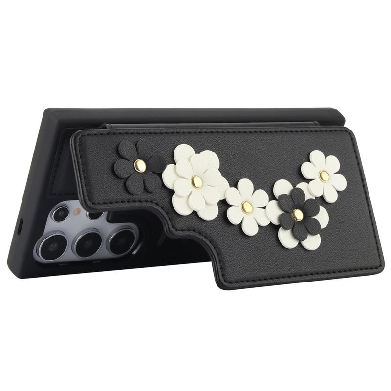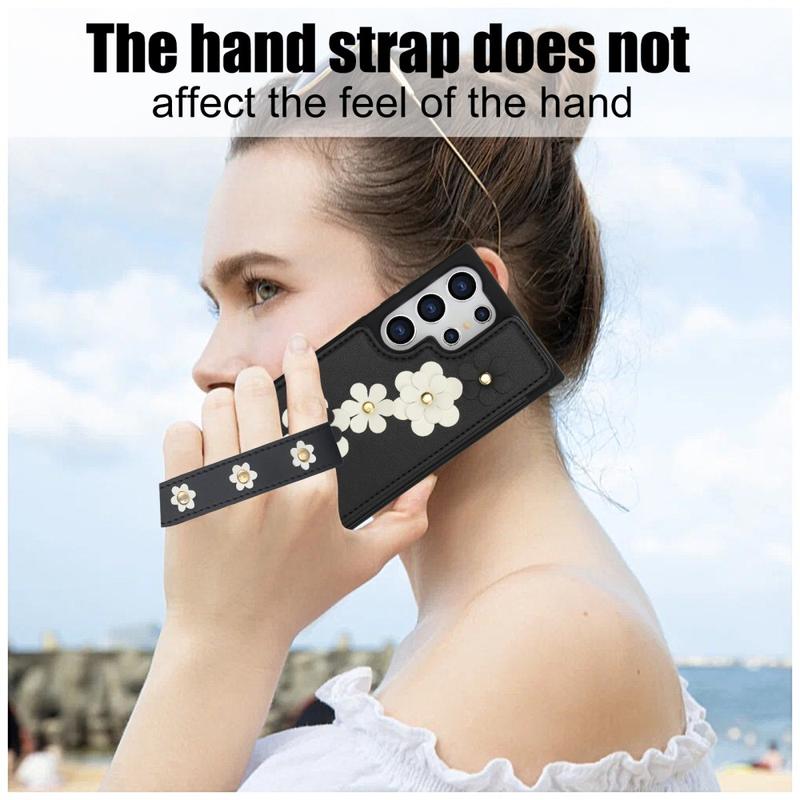 The Samsung Galaxy S24 Ultra Flower Decor Case is crafted from polyurethane and TPU materials, providing durable protection. The stylish design features flowers on the back of the case and hand strap. It includes a card slot for storing up to 4 essential cards, and the back card holder can also be used as a kickstand for multiple viewing angles. The magnetic button keeps the cards secure, while precise cutouts allow full access to all buttons and ports. Protect your phone from daily damage with this convenient case that comes with a hand strap and shoulder strap for easy carrying.