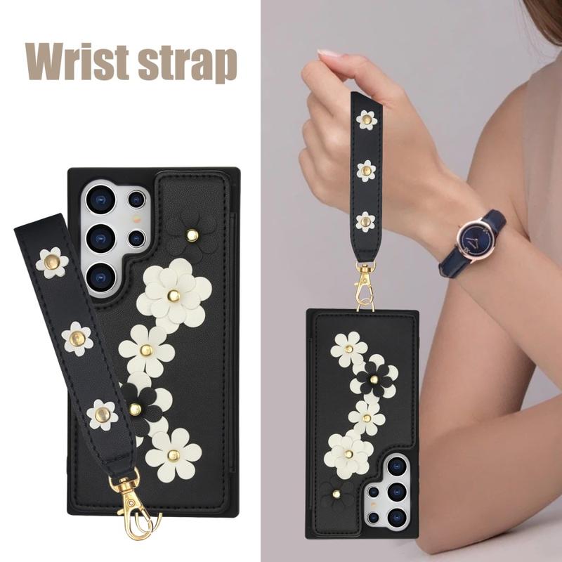 Flower Decor Case with Strap and Card Slots for Samsung Galaxy S24 Ultra