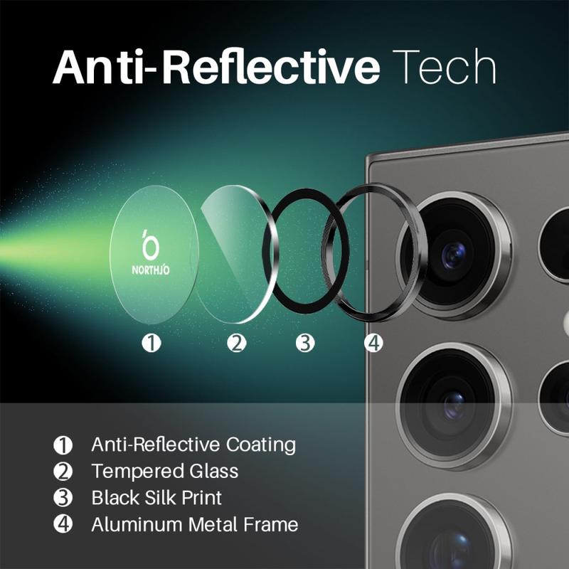 Upgrade your Samsung Galaxy S25 Ultra with the Northjo camera lens protector. Featuring a CD veins aluminum ring, it adds a sleek, modern touch to your Samsung Galaxy S25 Ultra while offering robust protection. The 9H tempered glass safeguards against scratches, impacts, and dust, ensuring your camera lens stays crystal clear. With easy, tool-free installation, you can enhance your Samsung Galaxy S25 Ultra durability and aesthetics in seconds.