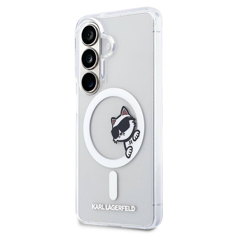 Show your personality with the Karl Lagerfeld IML Choupette Peekaboo Logo magnetic case for Samsung Galaxy S26+. This premium hybrid back cover combines fashion and protection, featuring the iconic Choupette Peekaboo motif and signature logo. Built from rigid PC and flexible TPU, it offers reliable everyday protection while maintaining a slim and comfortable feel in the hand.