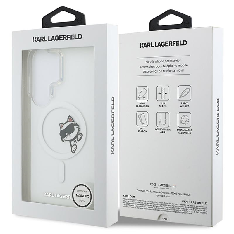Show your personality with the Karl Lagerfeld IML Choupette Peekaboo Logo magnetic case for Samsung Galaxy S26 Ultra. This premium hybrid back cover combines fashion and protection, featuring the iconic Choupette Peekaboo motif and signature logo. Built from rigid PC and flexible TPU, it offers reliable everyday protection while maintaining a slim and comfortable feel in the hand.