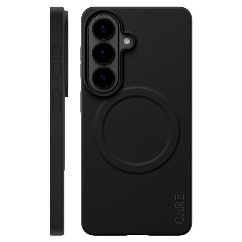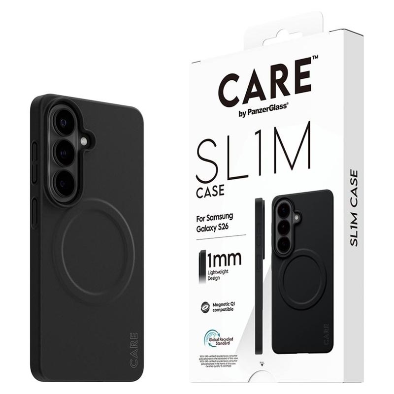 Meet the case that protects without hiding your Samsung Galaxy S26. The CARE by PanzerGlass SL1M MagSafe Case for Samsung Galaxy S26 is ultra-slim at just 1 mm, so your Samsung Galaxy S26 keeps its sleek feel and natural look—while gaining everyday protection against drops, shocks, and scratches. It’s fully MagSafe-compatible, making it easy to snap on magnetic chargers and accessories, and it’s made from 100% recycled plastic for a more responsible choice. A special Nanotech coating helps resist sweat, makeup stains, and everyday grime, keeping the case looking clean for longer.