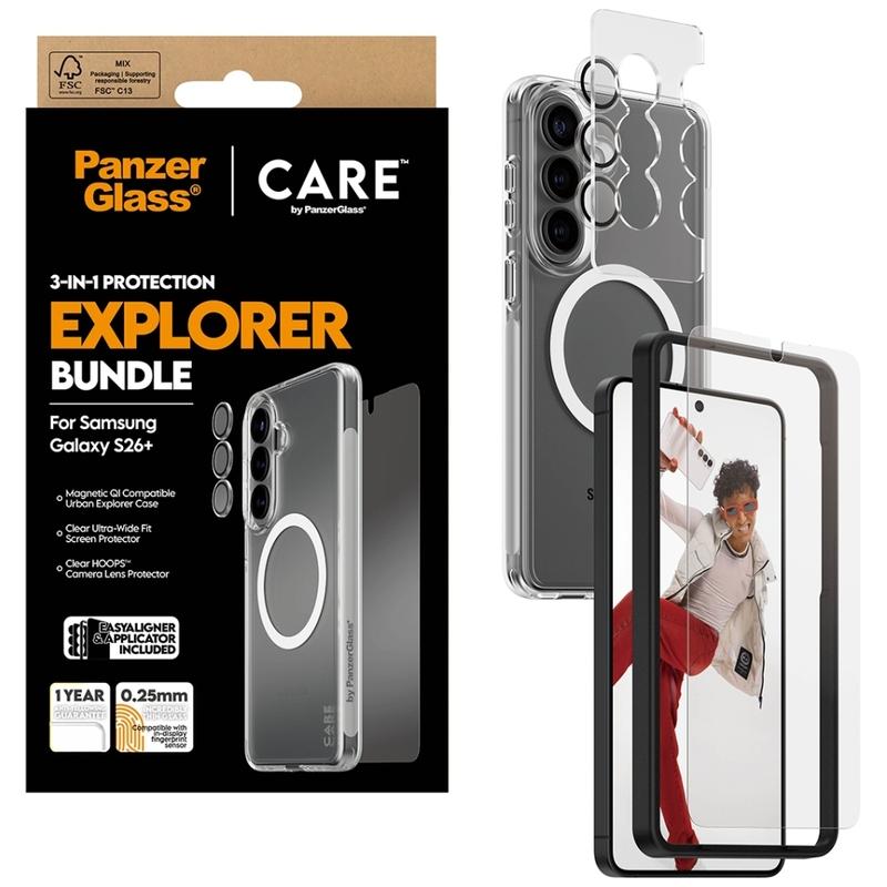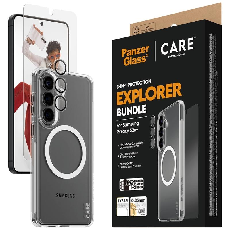 Give your Samsung Galaxy S26+ complete protection in one go with the CARE by PanzerGlass 3-in-1 Explorer Bundle. This all-in-one set combines an Ultra-Wide Fit screen protector, transparent camera lens protection, and a tough transparent case, so your phone is covered from the front glass to the camera module and the back. Built for everyday city life and weekend adventures, it is designed to handle drops, scratches, and bumps while keeping your phone s original design visible.