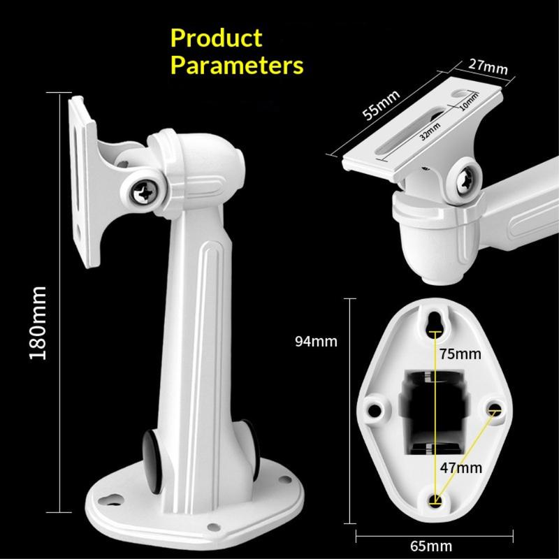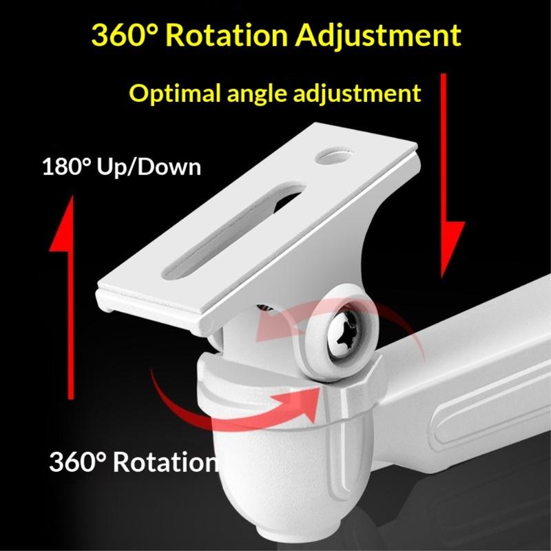 The bracket allows 360° horizontal rotation and 180° vertical adjustment, enabling comprehensive camera positioning. This wide adjustment range helps eliminate blind spots and ensures optimal coverage of the monitored area.