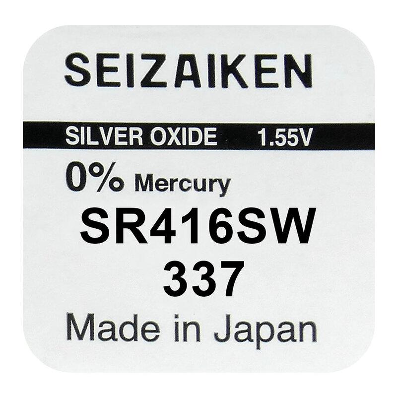 The Seizaiken 337 SR416SW Silver Oxide Battery is specifically designed for use in watches. It comes in a blister pack containing 1 piece. This high-quality battery is produced by Seizaiken, a subsidiary of SEIKO, and is made in Japan. It is also known by other designations such as 416 and sr416sw.