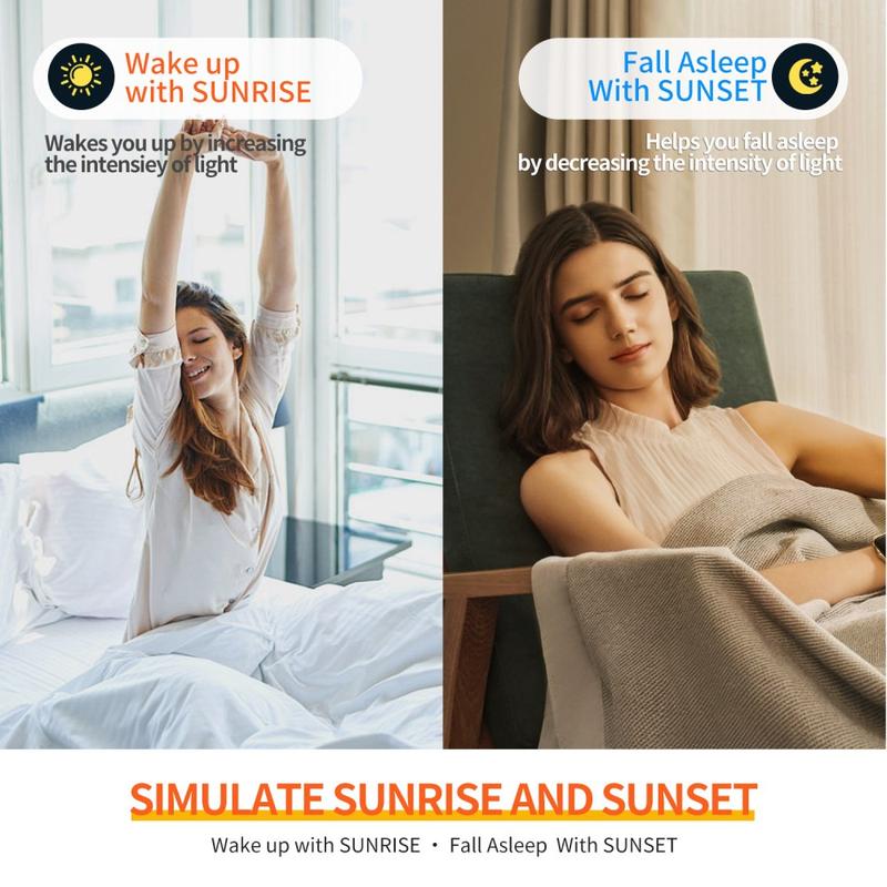 - Gentle wake-up: use the sunrise light with a soft alarm sound for calmer mornings