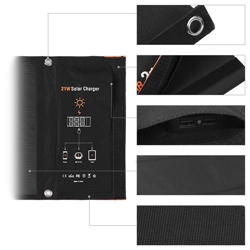 Bez ohledu na to, jak daleko od civilizace jste, můžete se vždy spolehnout na sluneční energii na dobití smartphonu, tabletu, smartwatch, energetické banky a dalších zařízení. Tato solární nabíječka má tři vysoce efektivní panely a poskytuje rychlé nabíjení až 21 W.