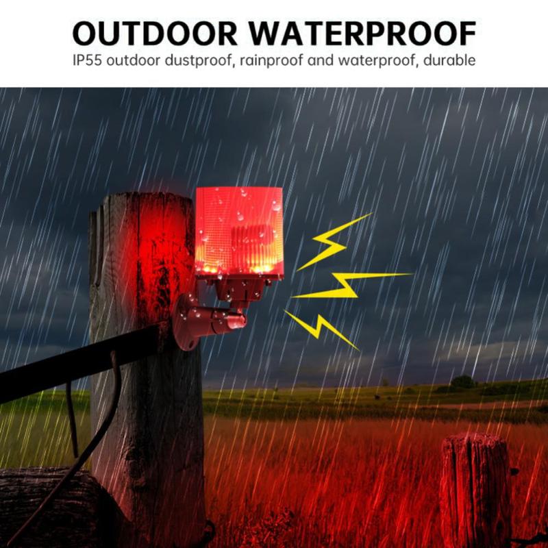 - Eight flashing red LEDs - strobe effect reinforces the alarm to disorient intruders and animals.