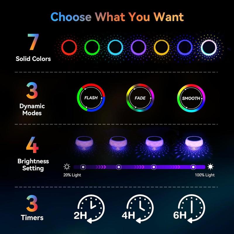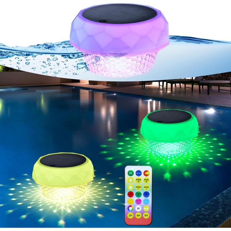 Brighten night swims and help keep water clearer without cables or batteries. This solar-powered floating lamp combines a high-output RGB LED ring with an internal disinfection box that works in tandem to limit algae and bacterial growth. A monocrystalline 5 V panel refuels the 1200 mAh lithium battery in daylight, then the lamp switches on automatically at dusk for up to twelve hours of vivid colour. Choose eight solid shades or three colour-changing shows from the handheld remote and set the built-in timer for 4, 6 or 8 hours—perfect for pools, hot tubs and ornamental ponds.