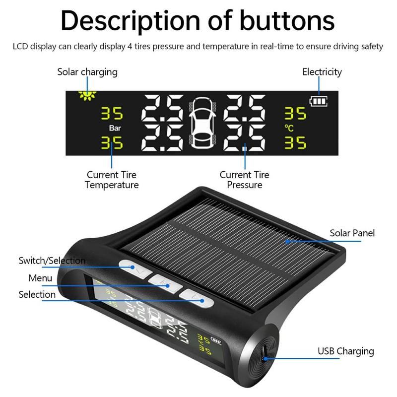 Solar-Powered Wireless Tire Pressure Monitor System with LCD Display and 4 External Sensors