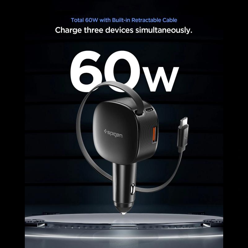 Spigen EV603BT Essential Car Charger - 60W Fast Charging with Retractable USB-C Cable and USB-C, USB-A Ports