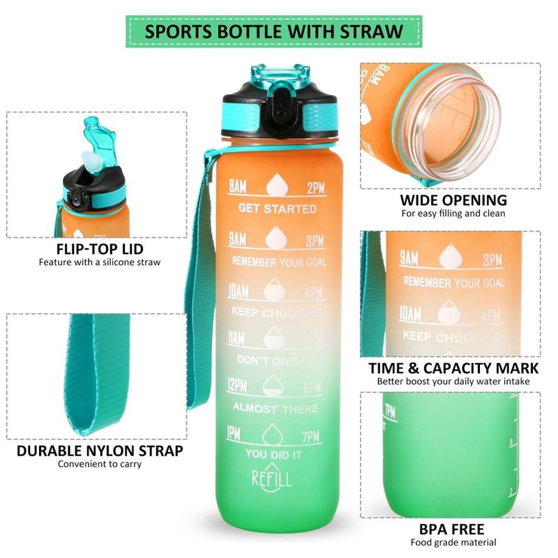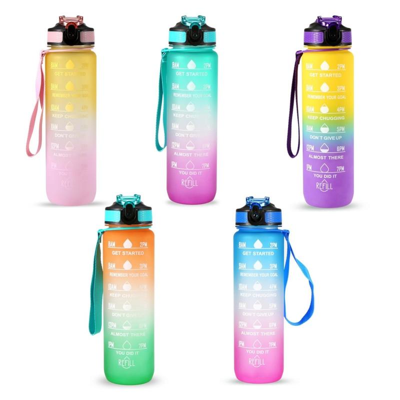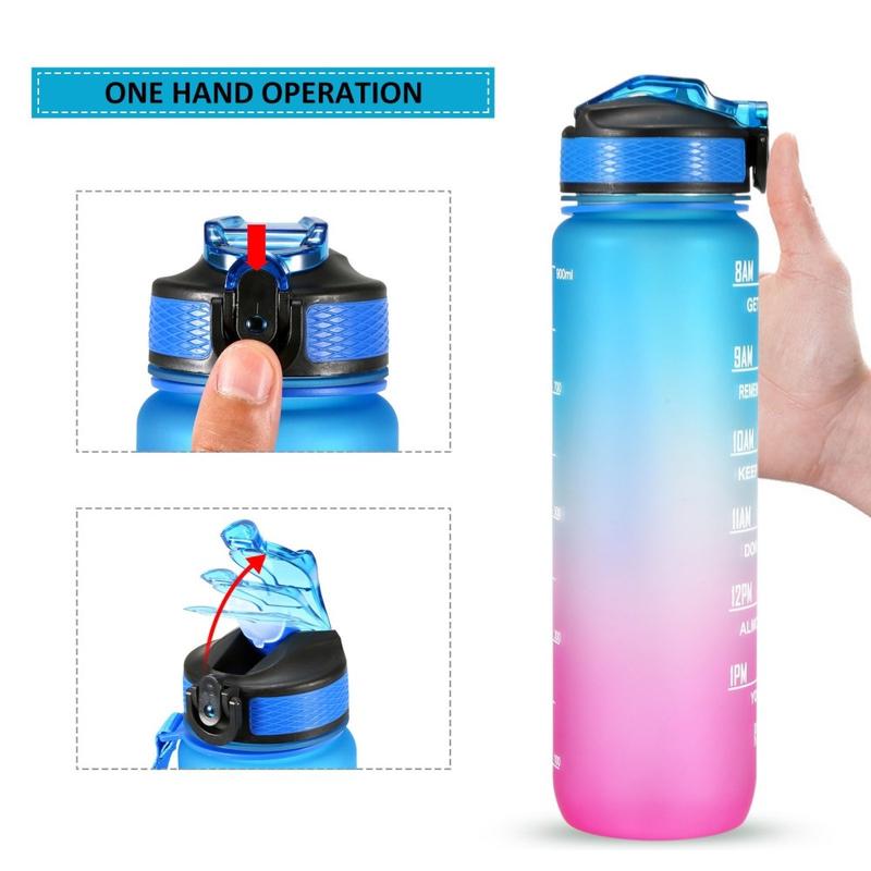 Tato láhev na vodu o objemu 1 l je opatřena ukazatelem času a inspirativními citáty, které vám pomohou udržet si motivaci k pití dostatečného množství vody po celý den. Ideální na tréninky, běh, turistiku, cyklistiku, jízdu na kole, kempování, jógu nebo jiné sporty doma, v posilovně, v kanceláři nebo v přírodě.