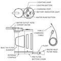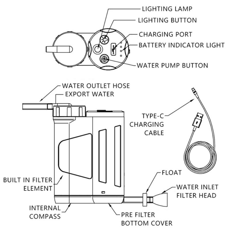 Equipped with an LED light function, this tool also serves as a reliable source of high-brightness illumination, making it ideal for use during nighttime activities or in emergency situations. The built-in 2400mAh rechargeable battery ensures long-lasting performance, and the included charging cable makes it easy to keep the water filter fully charged.