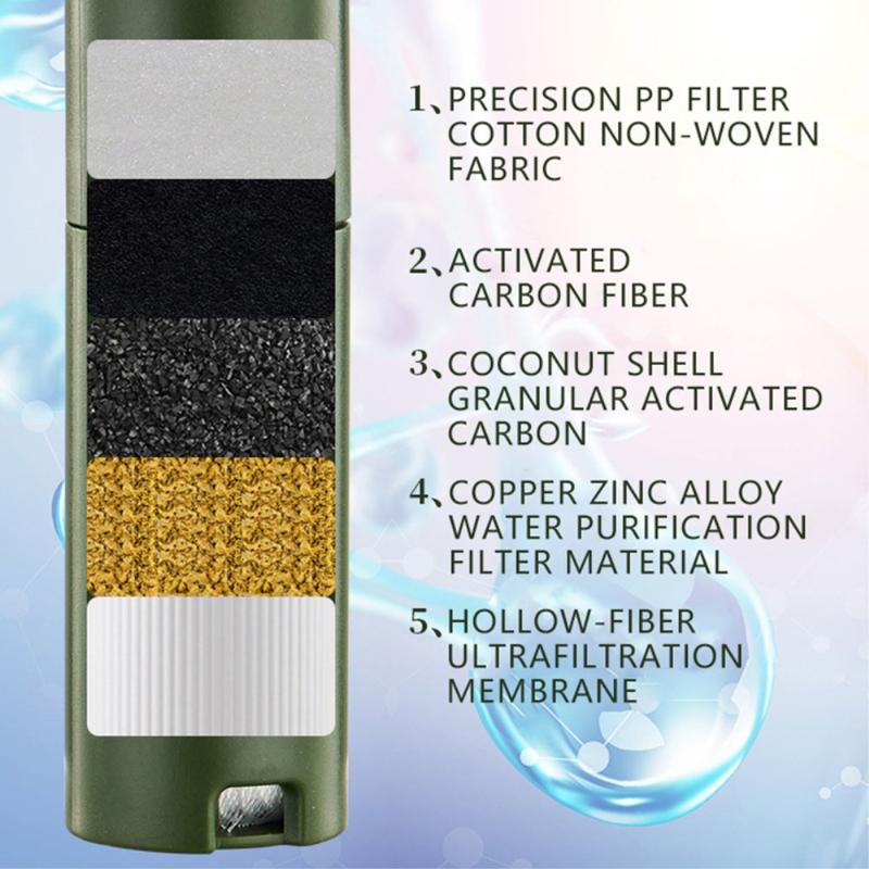 With a filtration precision of 0.01 micron and a total water purification volume of over 3000L, this water filter is capable of providing clean and safe drinking water from Category 1-3 surface water sources without chemical pollution. The product material includes ABS plastic, silicone, ultrafiltration membrane, carbon fiber, copper-zinc alloy water purification material, coconut shell granular activated carbon, PP filter, and stainless steel filter, ensuring reliable and effective water purification.