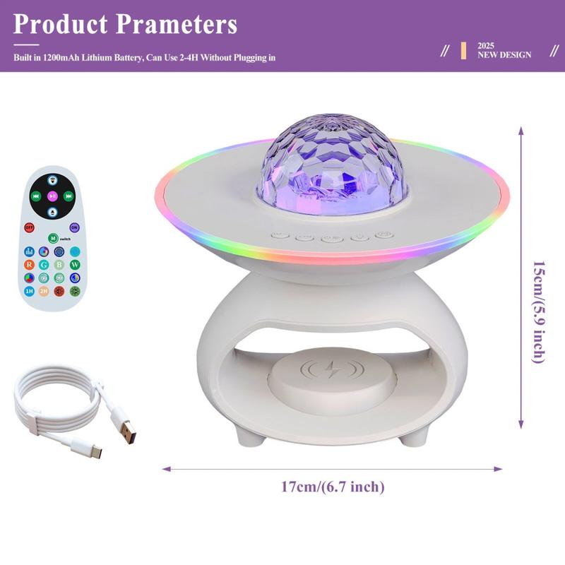 Add atmosphere, audio and effortless charging to any bedside or workspace. The TCSP-001-C projects a galaxy of colours, streams music over Bluetooth-compatible 5.0 and tops up your phone wire-free—all from a compact, USB-rechargeable design with handy remote control.