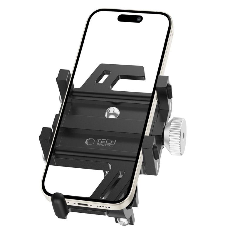 The V1 metal bicycle holder from Tech-Protect is the top choice in its segment, offering high-quality construction and functionality. Made of durable aluminum alloy, this bike holder features a handle with a thickened shaft and anti-slip mats for a secure grip on handlebars of bicycles or motorcycles. The adjustable jaws with ampullar screws allow for a rigid and secure fit for phones ranging from 55mm to 95mm in width. Additionally, the jaws are padded to prevent scratching and the holder can rotate 360°.