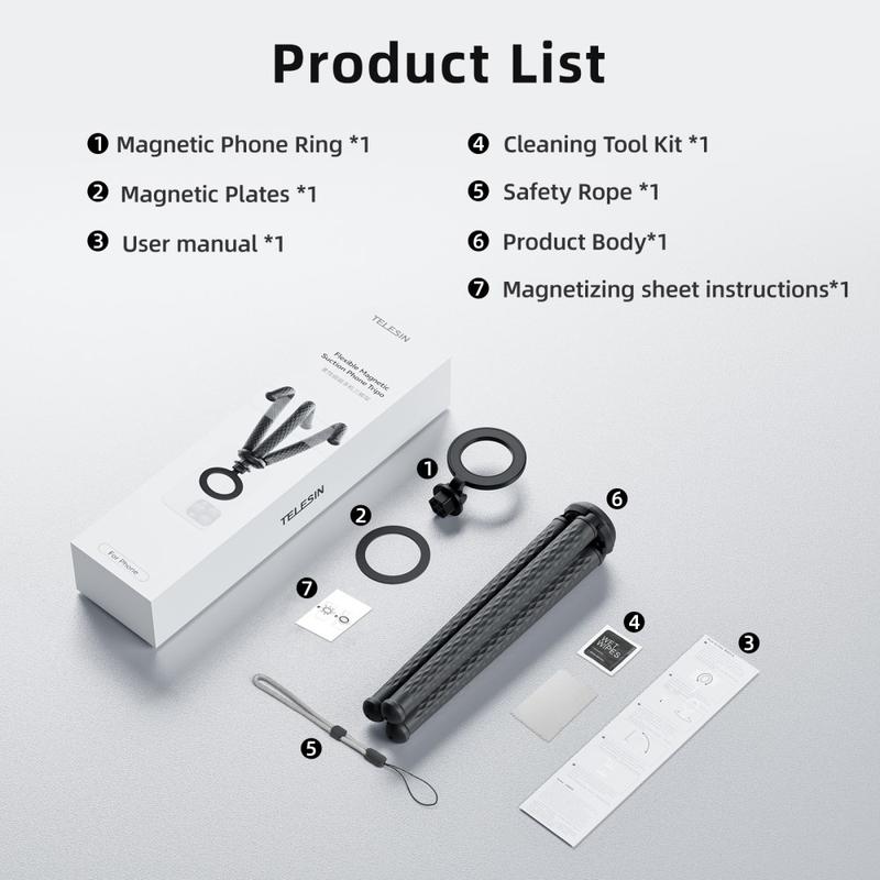 Snap on and shoot anywhere. The TELESIN P3-FM-02 combines a MagSafe-compatible magnetic ring mount with soft, silicone-wrapped aluminum legs you can bend around rails, balance on desks, or level on uneven ground. A friction joint dials in the viewing angle, while the interchangeable 1/4" thread lets you swap in action cams, compact lights, or other accessories in seconds.