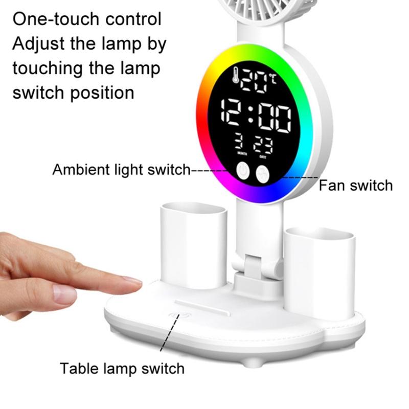 - All-in-One Design: Combines a lamp, clock, fan, and pen holder into one compact unit, saving space on your desk or nightstand.