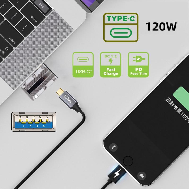 UC-029-TC002 USB 3.1 typ C samice na USB 3.0 typ A samec 90° levý úhel plochý typ 10Gb/s datový 120W napájecí adaptér
