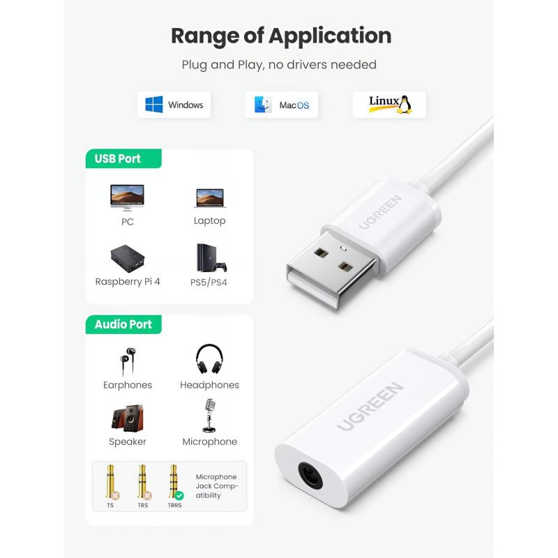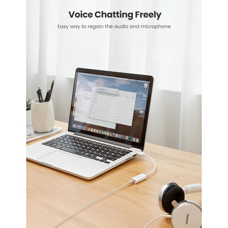 The UGREEN US206 USB audio adapter adds a 3.5 mm TRRS headset connection to devices that lack a dedicated audio jack or have a damaged port. It supports both audio output and microphone input through a single 3.5 mm connector, making it ideal for headsets, online meetings, gaming, and everyday communication. With simple plug and play operation and broad system compatibility, it offers a reliable and convenient audio solution without additional drivers.