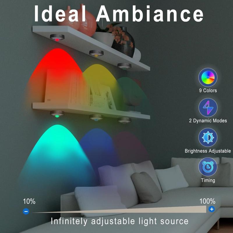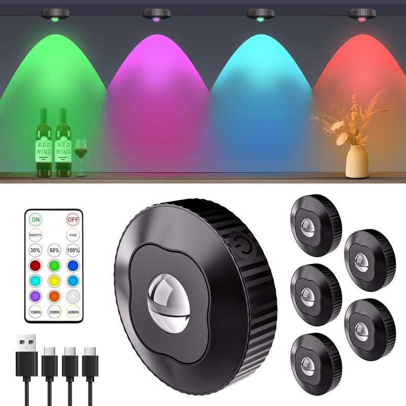 RGB Cabinet Lights - USB Rechargeable Ambient Night Light with Remote Control for Bedroom Mood Lighting - 6 Pcs.